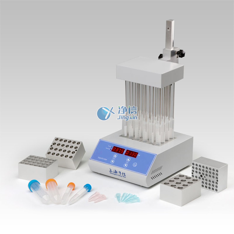 JXDC-20氮氣吹掃儀采用微電腦和PID模糊控制技術,利用鋁材料做為導熱介質,以代替?zhèn)鹘y(tǒng)的水浴裝置,具有使用方便、控溫范圍大、精度高等特點。其工作原理是將氮氣或空氣連續(xù)、可控地吹到加熱樣品表面,并根據(jù)被濃縮溶劑的蒸發(fā)速度和沸點,設定加熱溫度,實現(xiàn)大量樣品的濃縮。